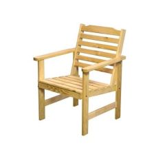 Неокрашенное садовое кресло с горизонтальной обрешеткой спинки и строгой формой подлокотников.