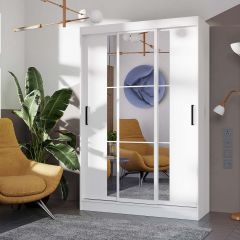 Трёхдверный шкаф-купе "Тайм" представляет собой сочетание практичности и функциональности. Это оптимальный вариант с точки зрения эргономики пространства. Раздвижные створки снабжены удобными ручками, центральная створка полностью декорирована зеркалом с еврокромкой, которое создаёт иллюзию расширенного пространства. Внутри с одной стороны находятся пять просторных полок для хранения вещей и постельного белья, с другой стороны – вместительная зона хранения с двумя горизонтальной хромированной штангой для одежды на вешалках. Все три створки шкафа подвижны.